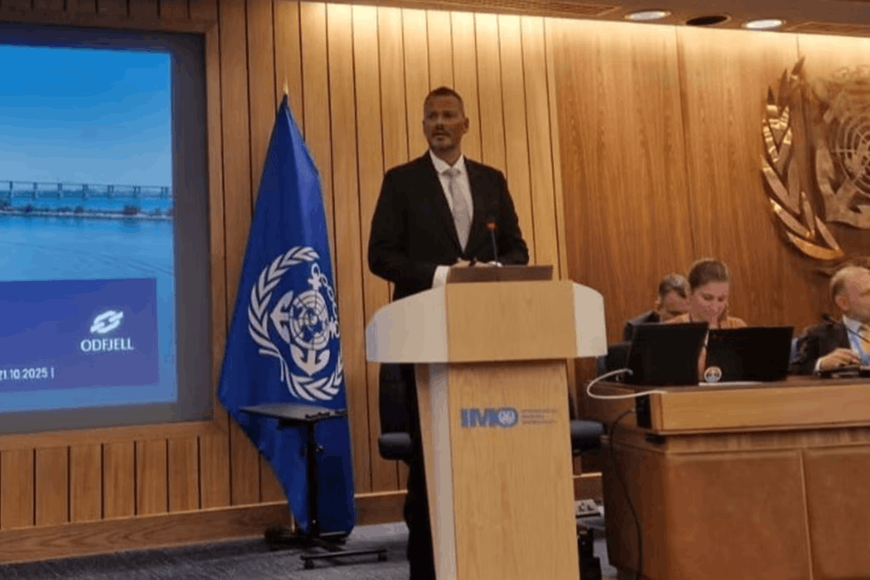 Odfjelll SE vice president of technology Erik Hjortland presents at the International Maritime Organization. (Photo: Odjfell)