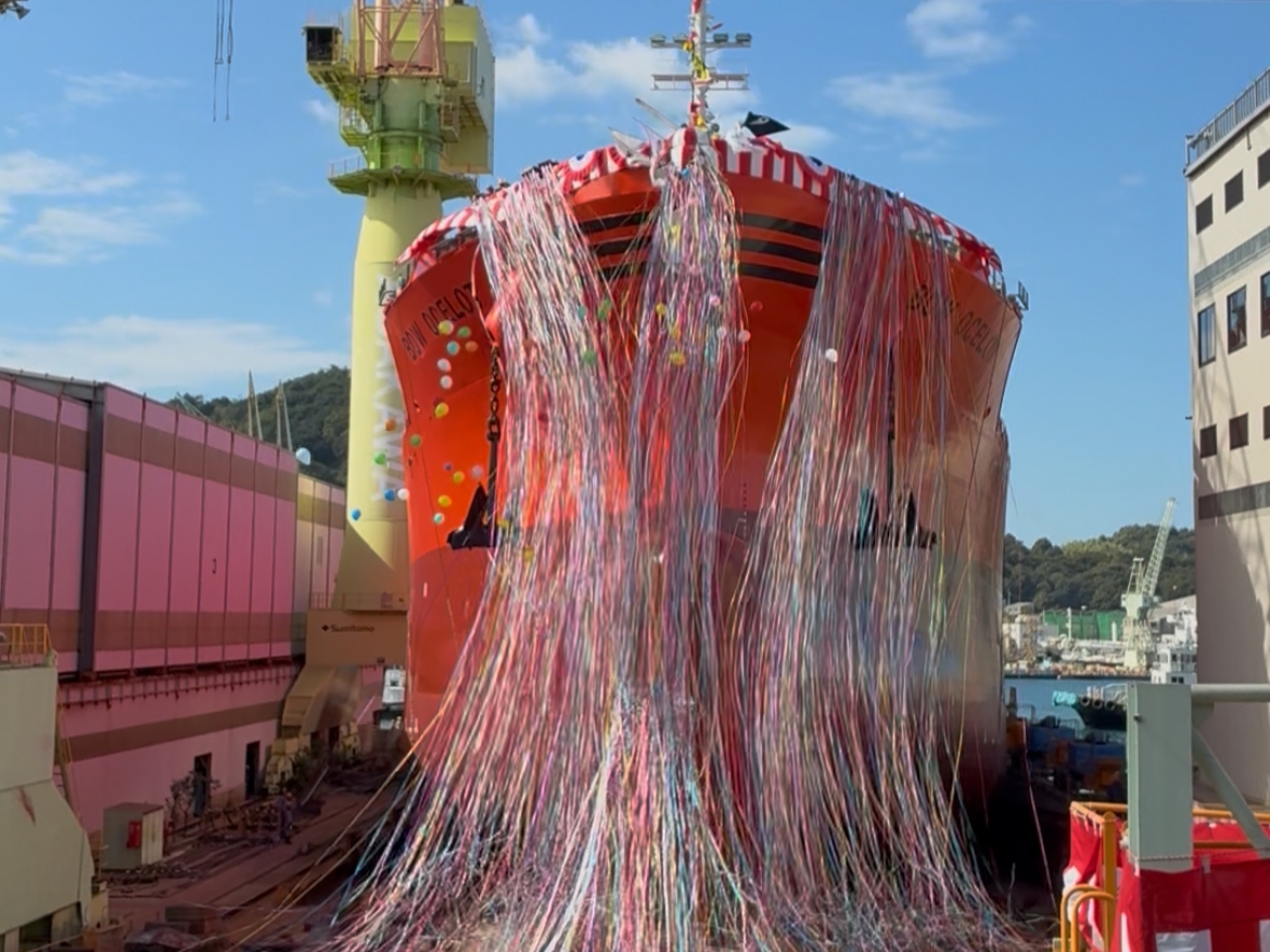 CEO Harald Fotland and godmother Signy Dame Fotland joined representatives from the yard, owners, and suppliers at the Asakawa shipyard for the ceremonial naming, rope-cutting, and launch.