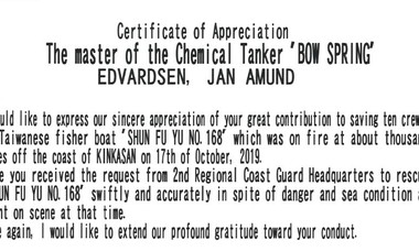 Bow Spring receives Certificate of Appreciation from Japan Coast Guard